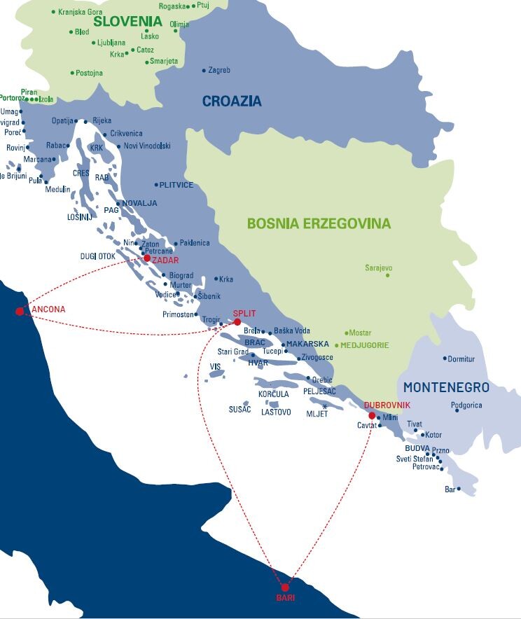 Le linee internazionali connettono i porti italiani di Ancona e Bari con:- Croazia: Porti di Zara, Spalato e Dubrovnik.