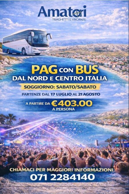 La quota include: bus A/R per Isola di Pag, alloggio a Novalja per 7 notti, assicurazione medico bagaglio, animazione Italiana H. 24